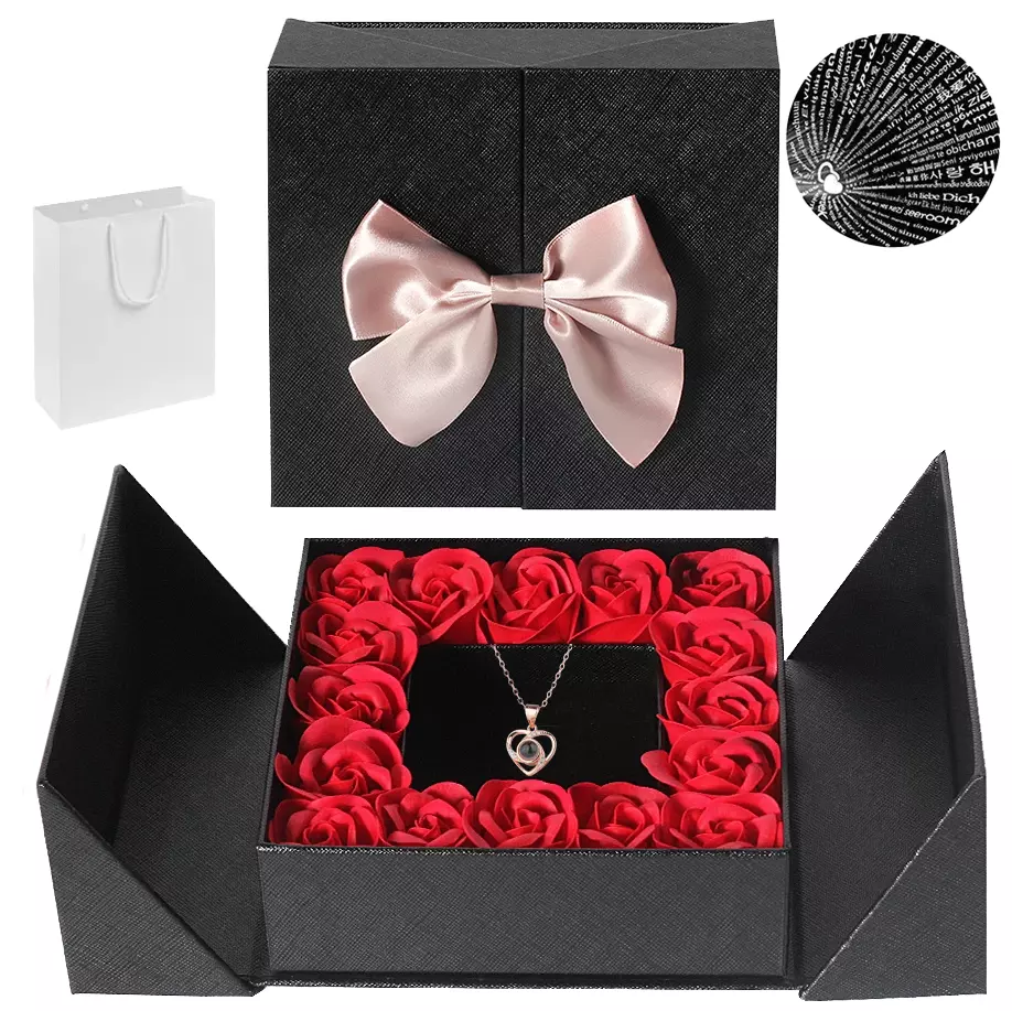 Внутри стильной чёрной коробки с атласным бантом скрывается сердце — подвеска с уникальной проекцией «I love you» на 100 языках мира и 16 ярко-красных роз из фоамирана.