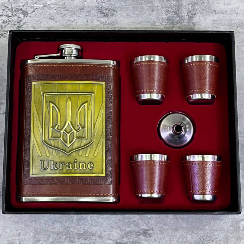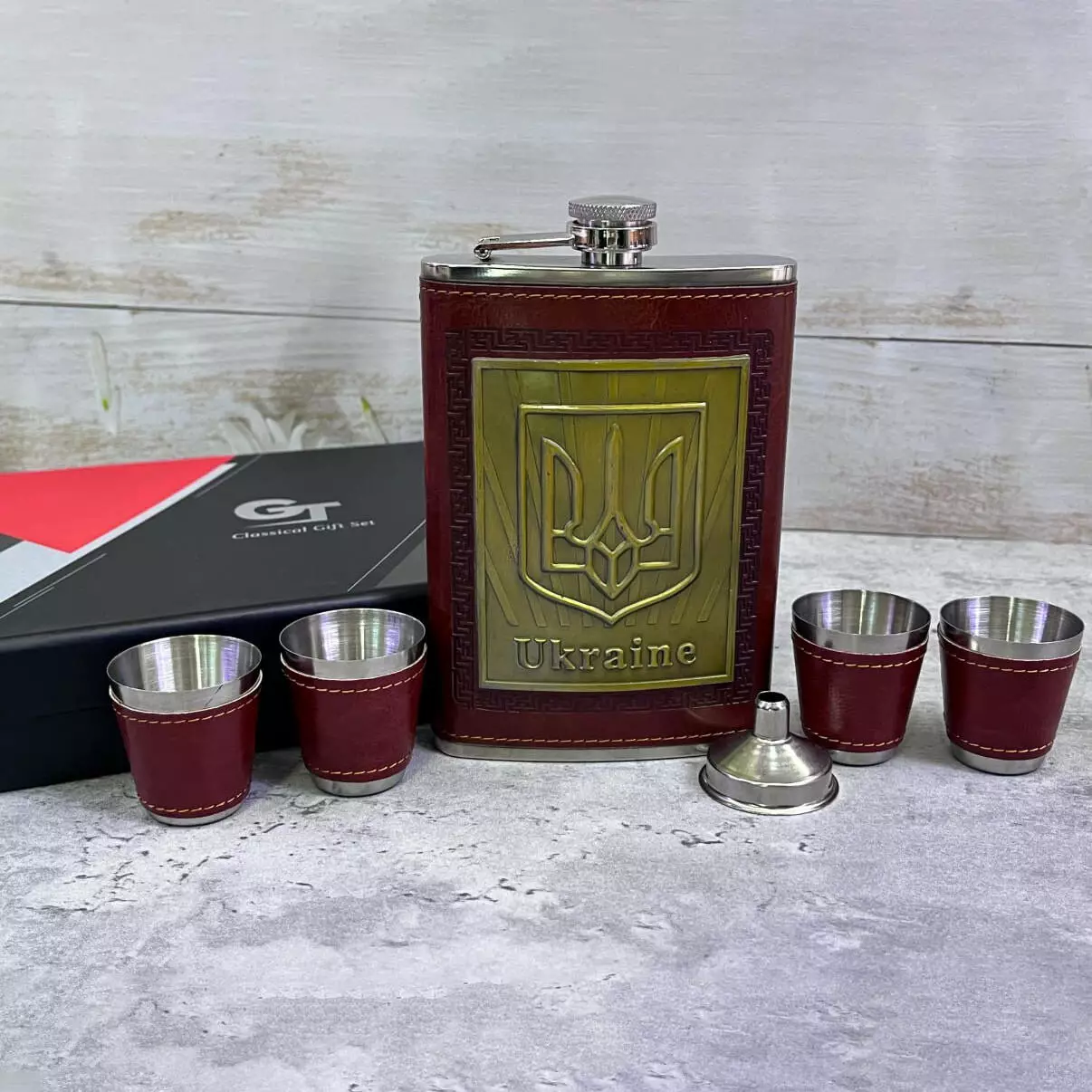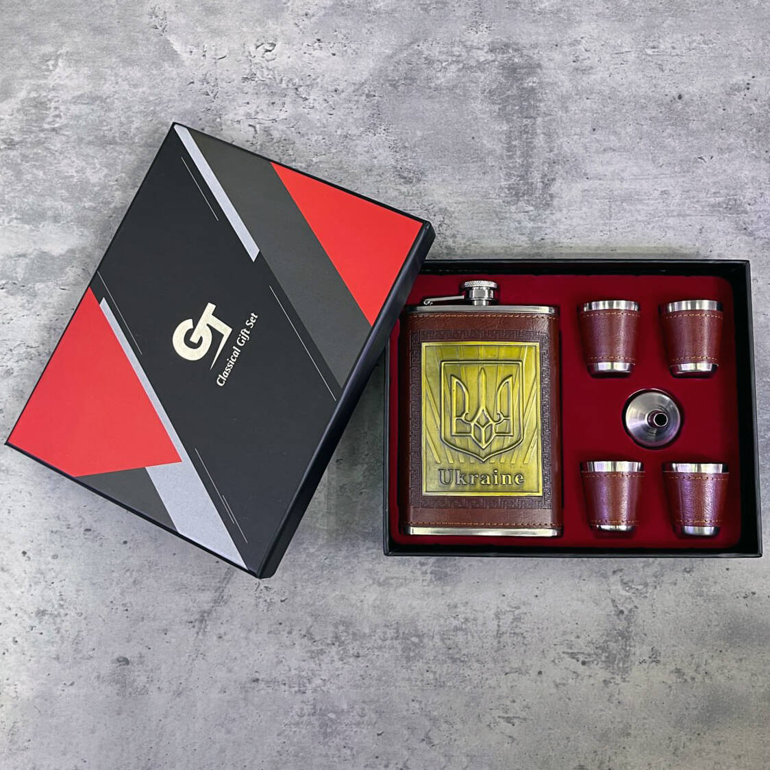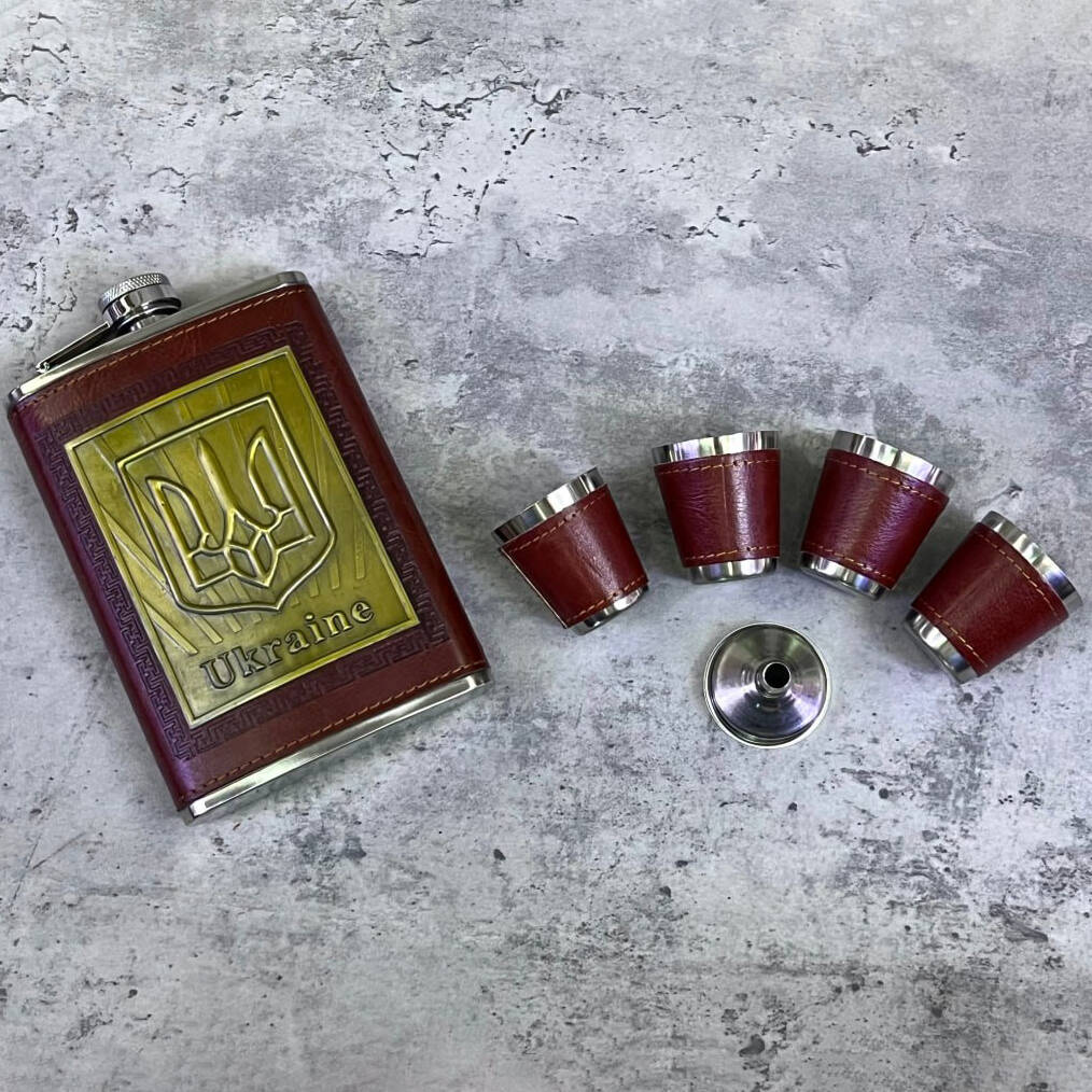 Подарочный набор Ukraine фляга / лейка / 4 рюмки (Кожа) TZ-12B коричневый