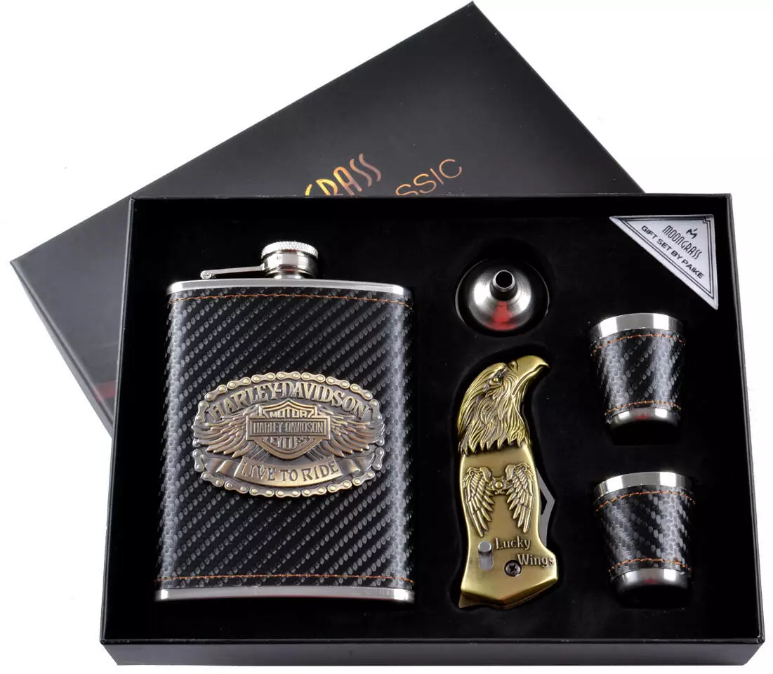 Подарочный набор 5в1 фляга, 2 рюмки, лейка, зажигалка-нож "HARLEY-DAVIDSON" N-113