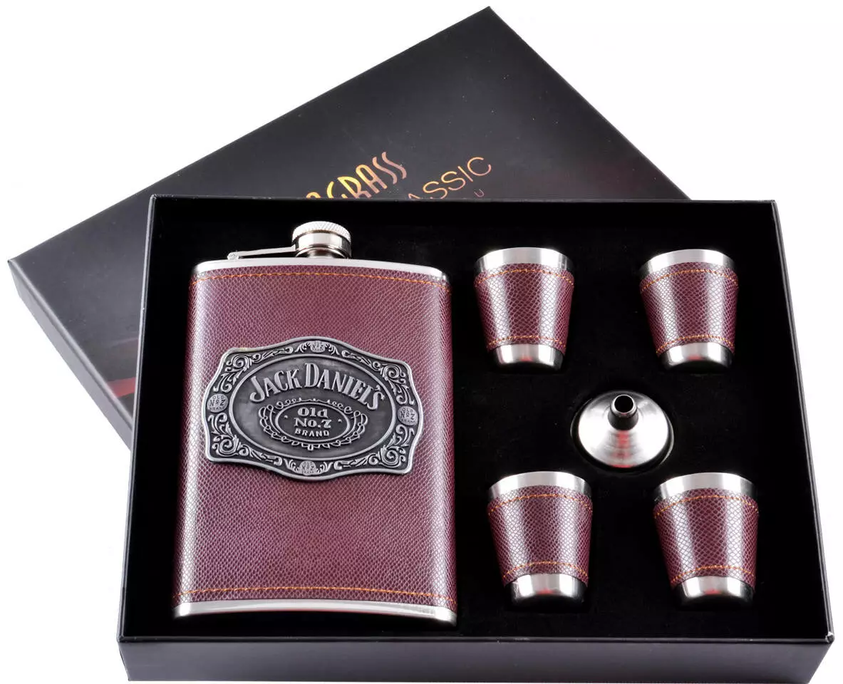 Подарочный набор 6в1 фляга с набойкой (обтянута кожей), 4 рюмки, лейка "Jack Daniels" DJH-1089