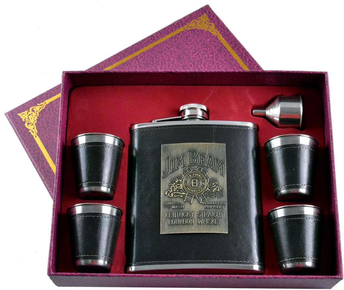 Подарочный набор 6в1 фляга с набойкой (обтянута кожей), 4 рюмки, лейка "Jim Beam" TZ-8