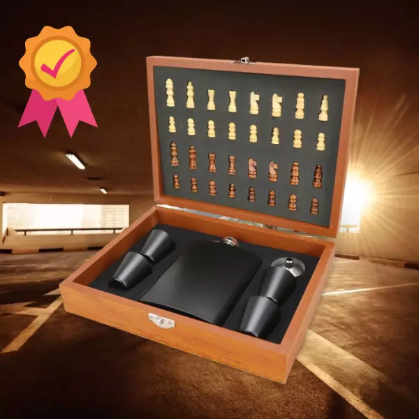 Подарочный набор (Дерево): Фляга (255 мл), Шахматы, Рюмки(4), Лейка D166