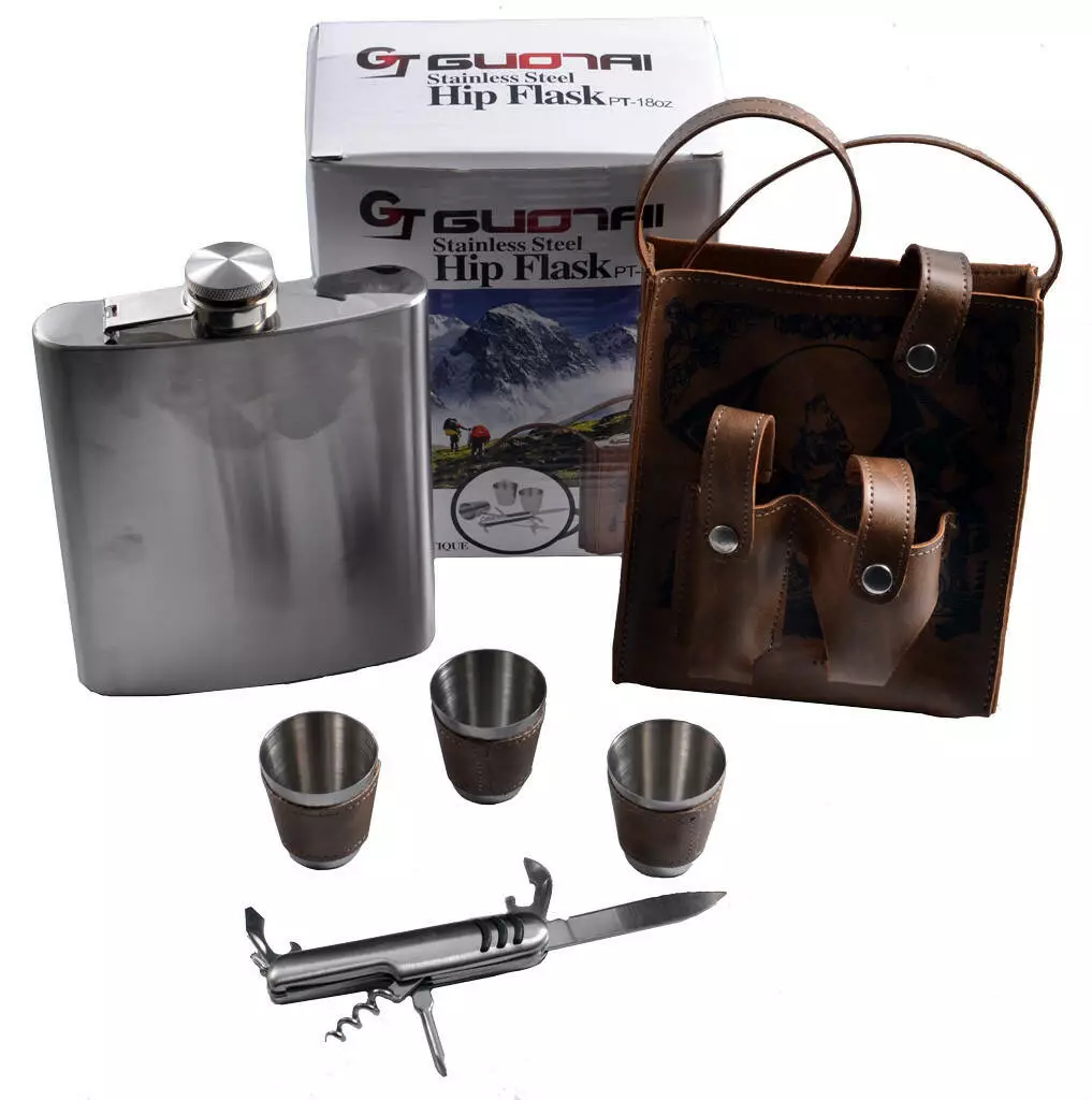 В комплекте есть металлические рюмки по 30 мл (3 шт), складной нож-штопор.