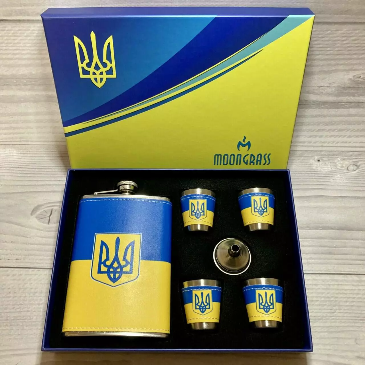 Подарочный набор MOONGRASS 6в1 с флягой, рюмками, лейкой Герб Украины WKL-006