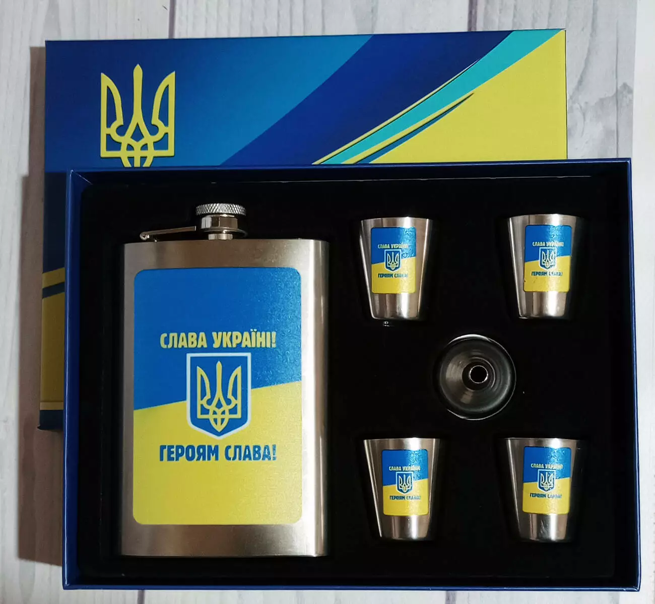 Подарочный набор MOONGRASS 6в1 с флягой, рюмками, лейкой " Слава Україні - Героям Слава " WKL-013