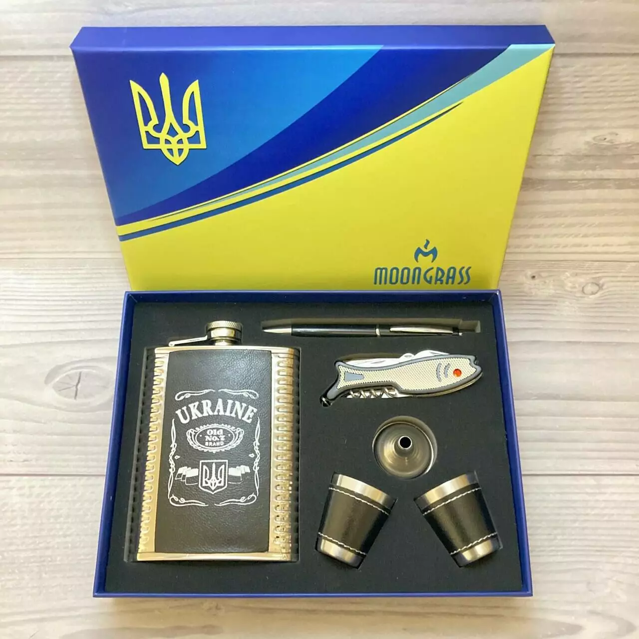 Подарочный набор MOONGRASS 6в1 с флягой, рюмками, ножом, ручкой, лейкой UKRAINE ???????? WKL-001