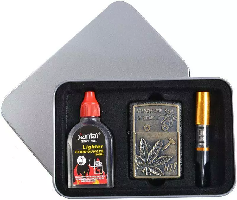 Подарочный набор (серия Конопля) 3в1 Зажигалка, бензин, мундштук 4710-4