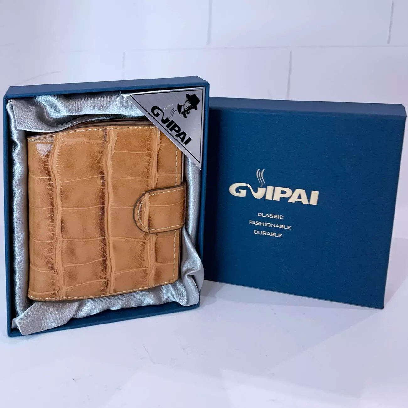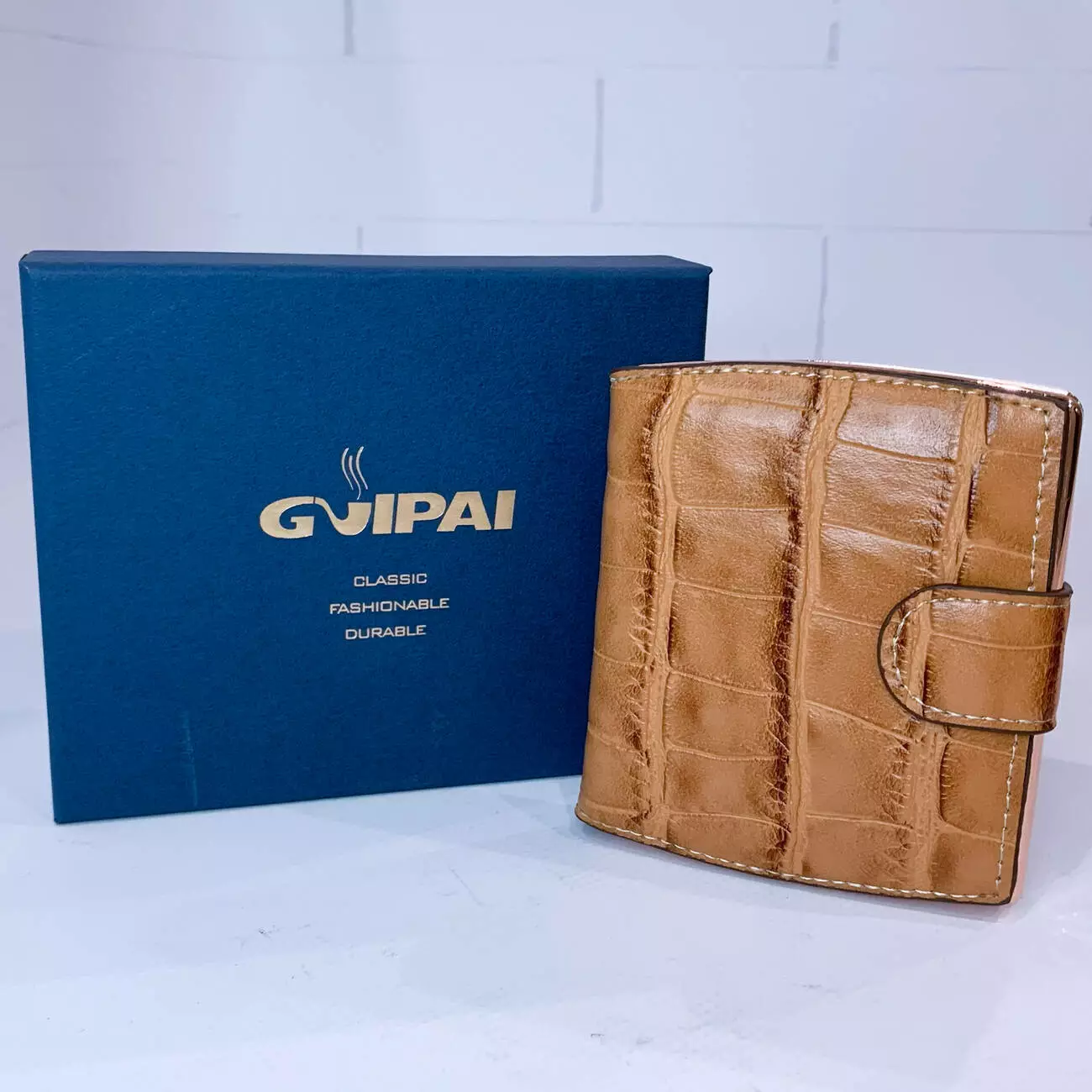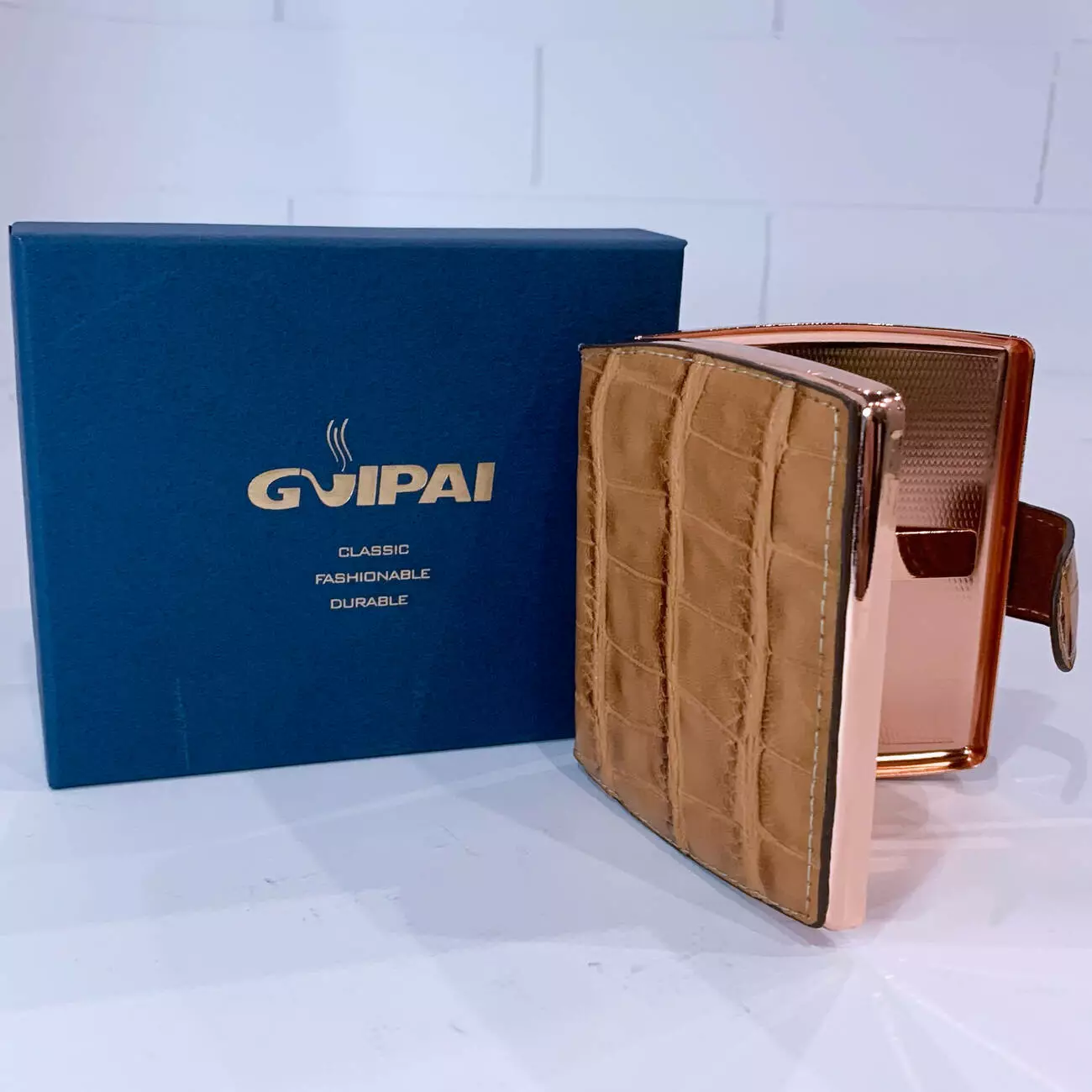 Элегантный и стильный аксессуар для хранения сигарет. Корпус выполнен из прочного металла, а обложка имеет декоративное покрытие с тиснением под кожу крокодила, что придаёт изделию роскошный и солидный вид. Надёжная защёлка обеспечивает удобное и безопасное закрытие.