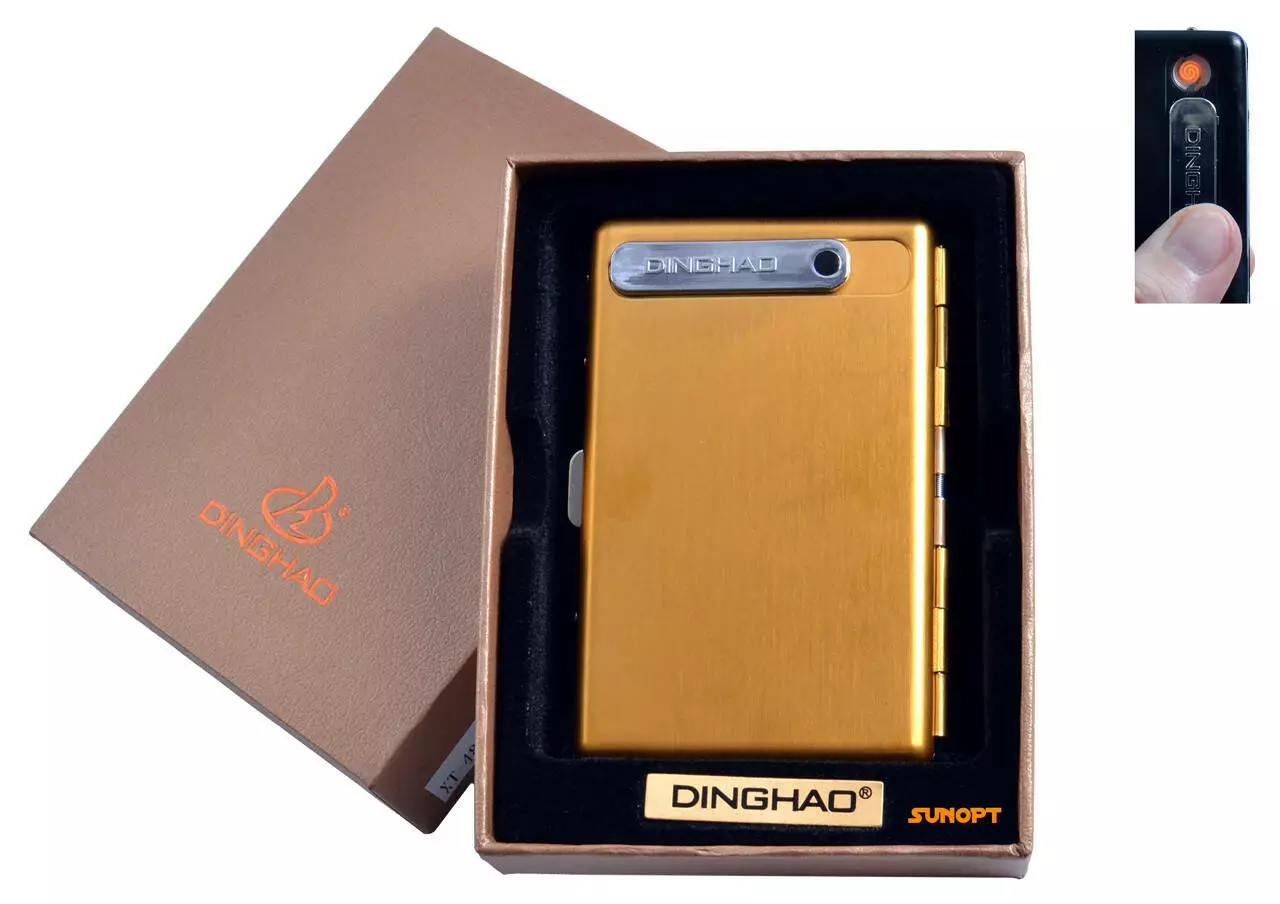 Портсигар + USB зажигалка (На 10 сигарет, Спираль накаливания) №4846 Gold