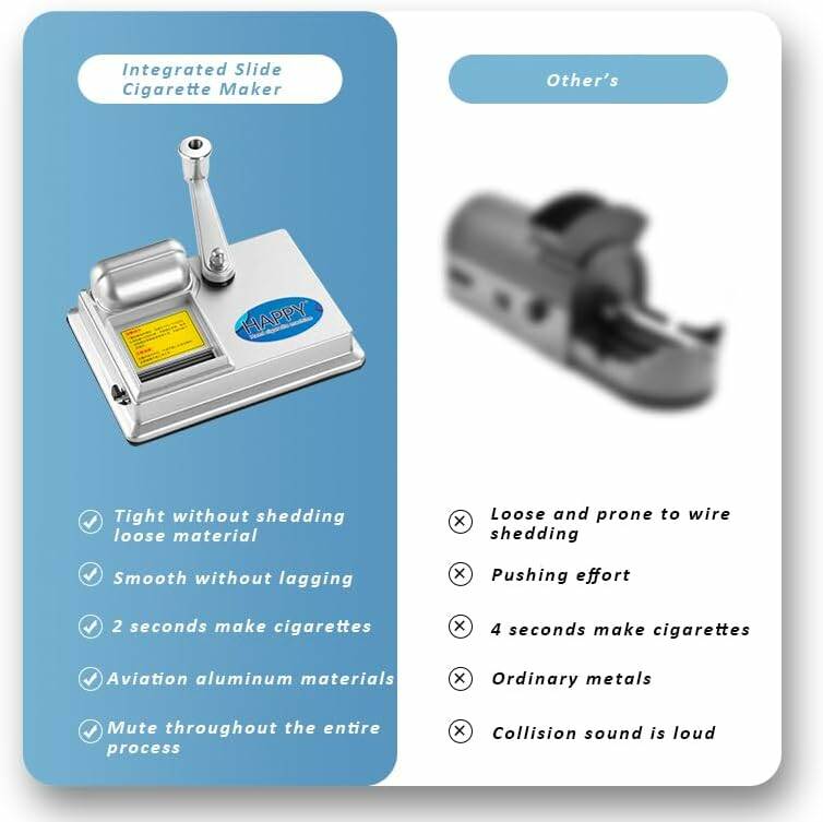 Благодаря интегрированному слайдерному механизму набивка происходит плотно, без просыпания табака и застреваний. Одна сигарета формируется всего за 1–2 секунды, а процесс проходит тихо и плавно, без резких ударов и лишнего усилия.