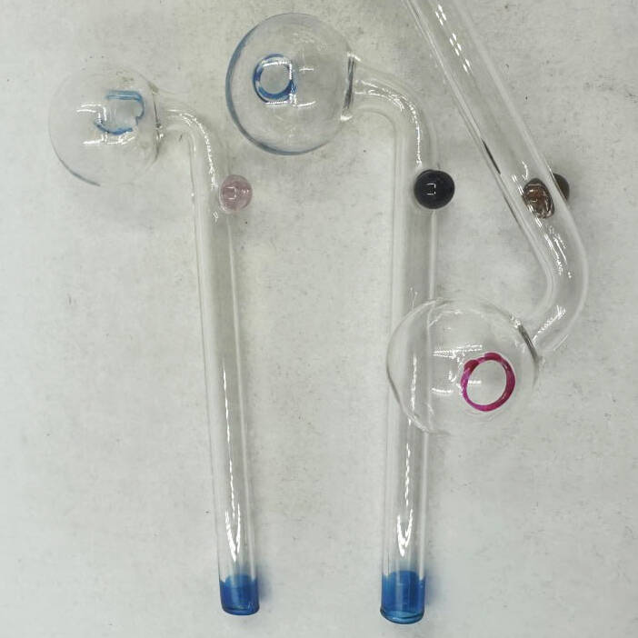 Эти стильные стеклянные трубки отличаются оригинальной изогнутой формой и аккуратными цветными акцентами на чаше и основании. Такой дизайн делает их не только практичными, но и визуально привлекательными.