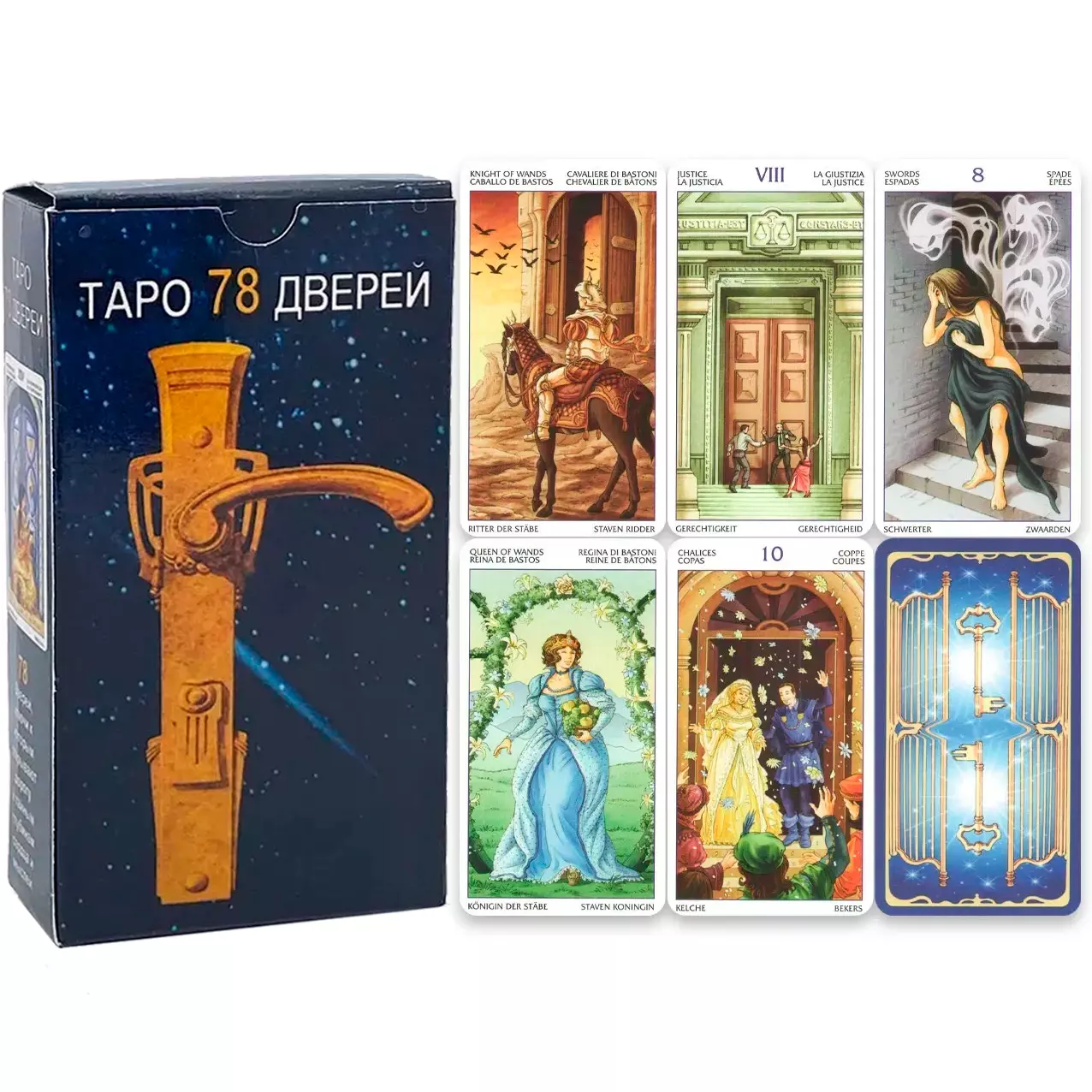 Таро 78 Дверей – Каждая карта символизирует дверь, за которой скрывается урок, подсказка или новый путь. Эта колода идеально подходит для предсказаний, самопознания и духовных практик.