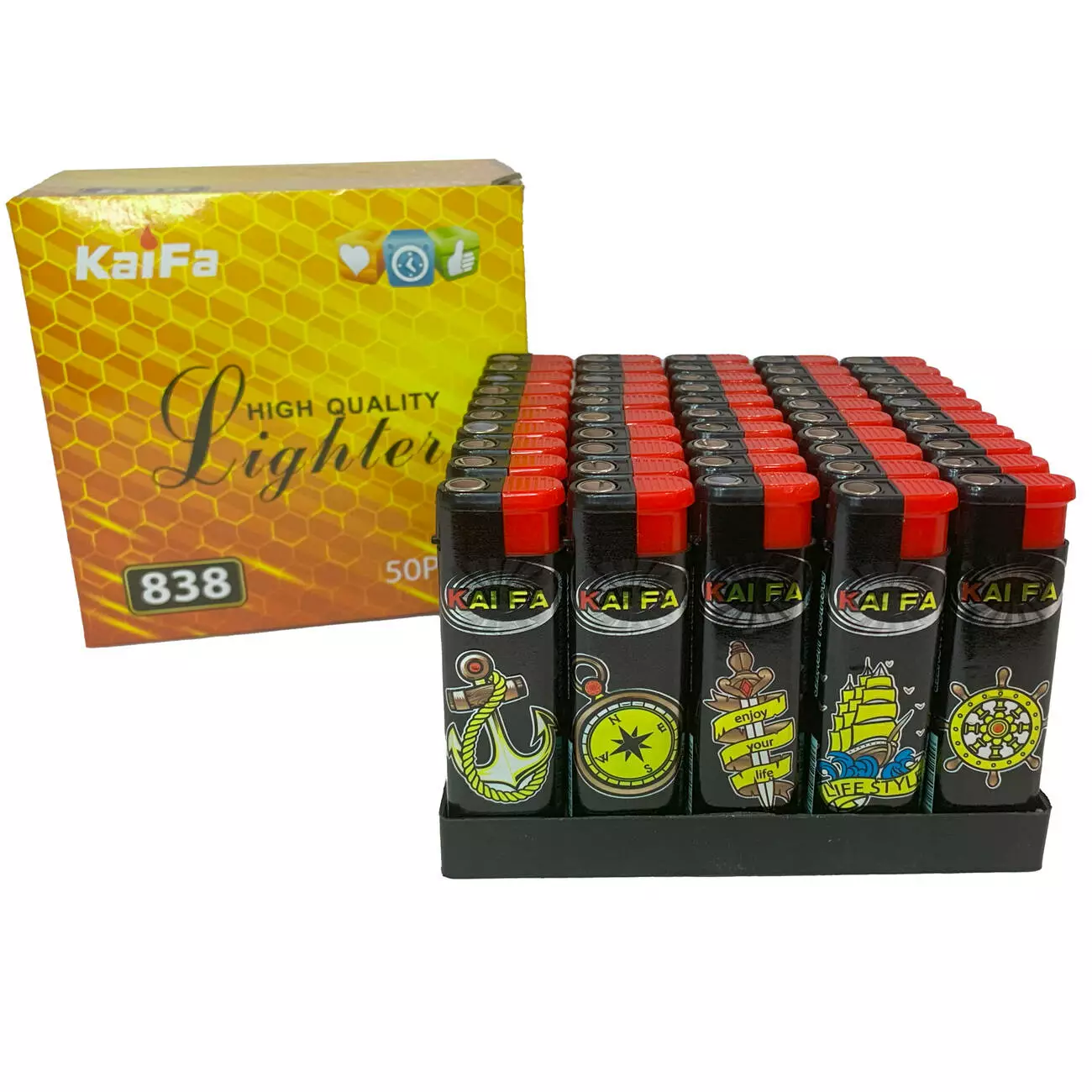 Дизайн зажигалок выполнен в морском стиле: на корпусе изображены якоря, компасы, корабли и штурвалы. Корпус черного цвета с логотипом "KAIFA" в верхней части, а верхняя часть зажигалок красная. Все зажигалки аккуратно уложены в пластиковый лоток.