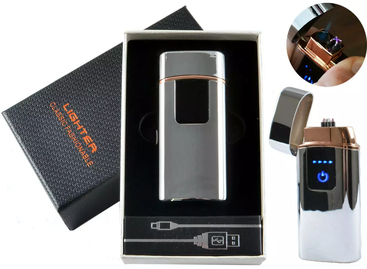 USB - Газовая Зажигалка (Острое пламя + две молнии) индикатор заряда HL-249 Silver ise