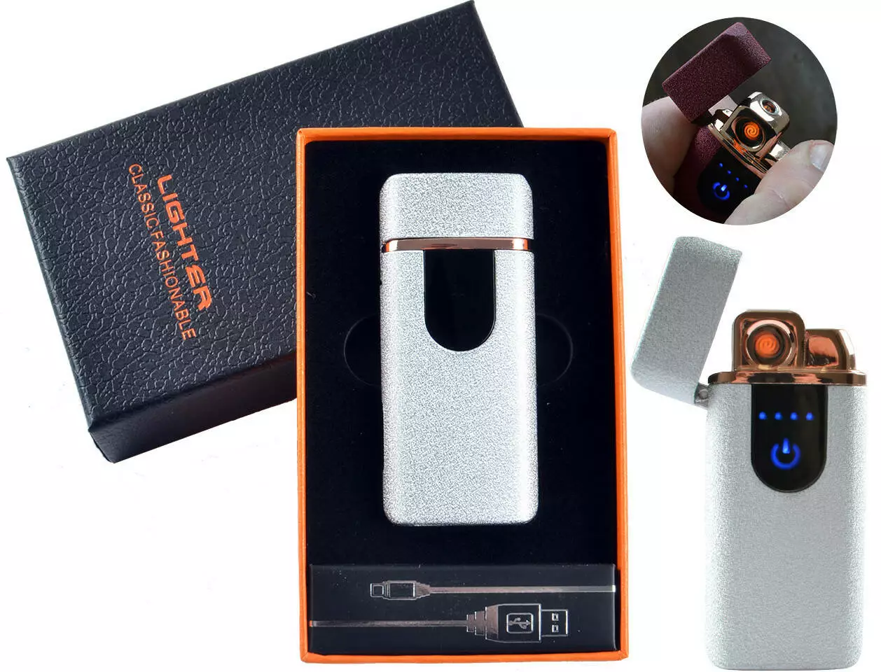 USB - Зажигалка газовая (Турбо пламя + спираль накаливания) индикатор заряда HL-248 Silver sand