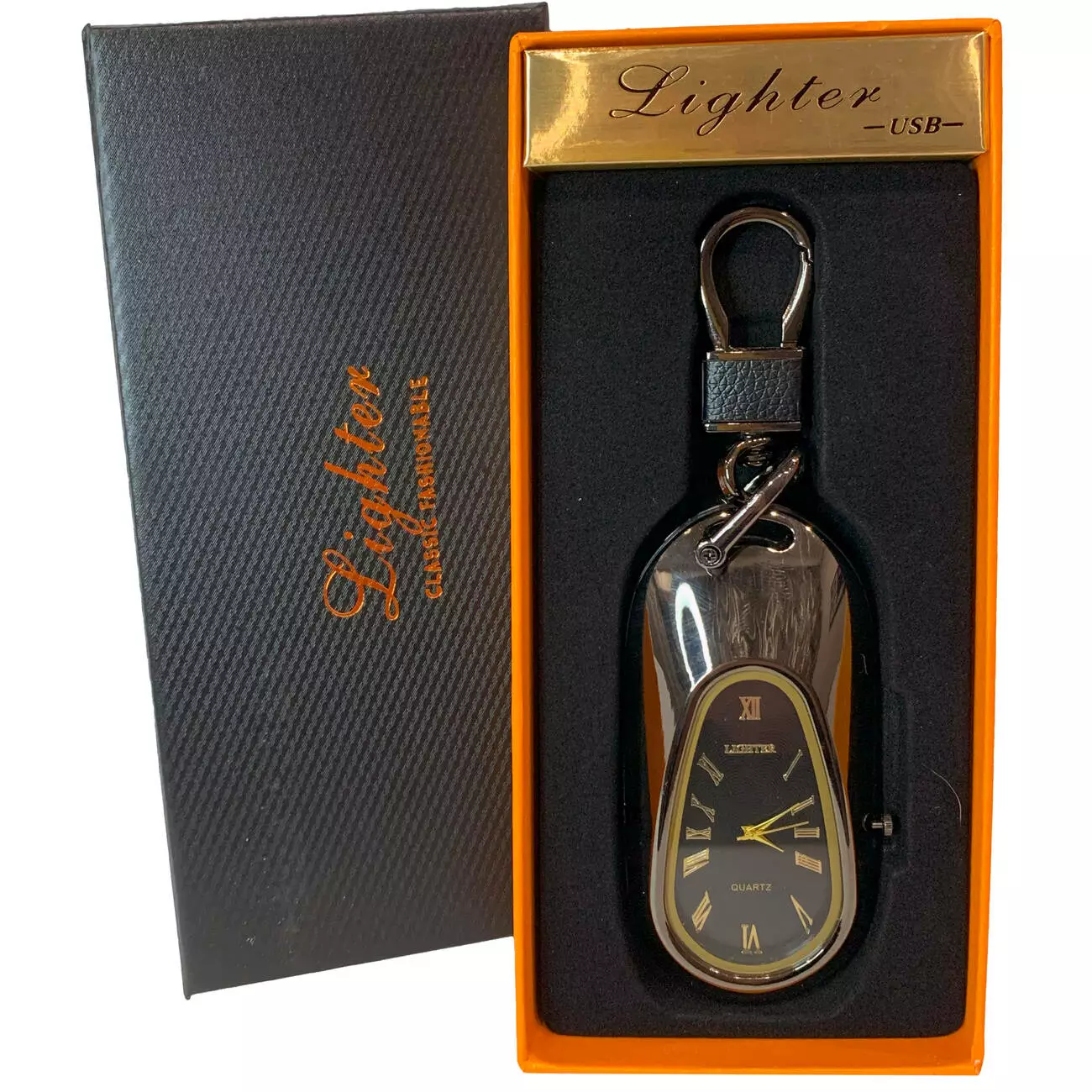 Многофункциональная USB-зажигалка с кварцевыми часами и карабином. Она сочетает в себе стильный аксессуар и практичное устройство для поджига.