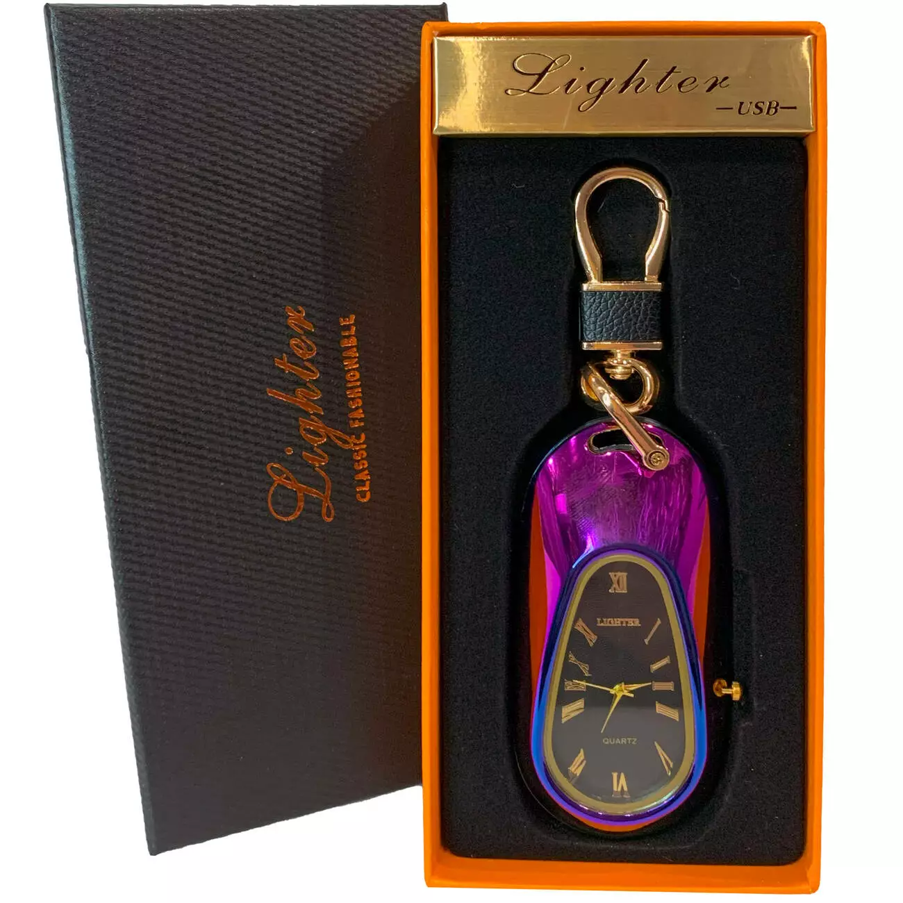 Многофункциональная USB-зажигалка с кварцевыми часами и карабином. Она сочетает в себе стильный аксессуар и практичное устройство для поджига.