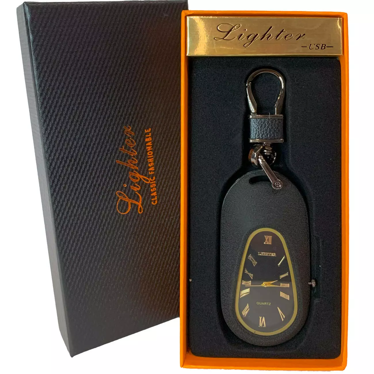 Многофункциональная USB-зажигалка с кварцевыми часами и карабином. Она сочетает в себе стильный аксессуар и практичное устройство для поджига.