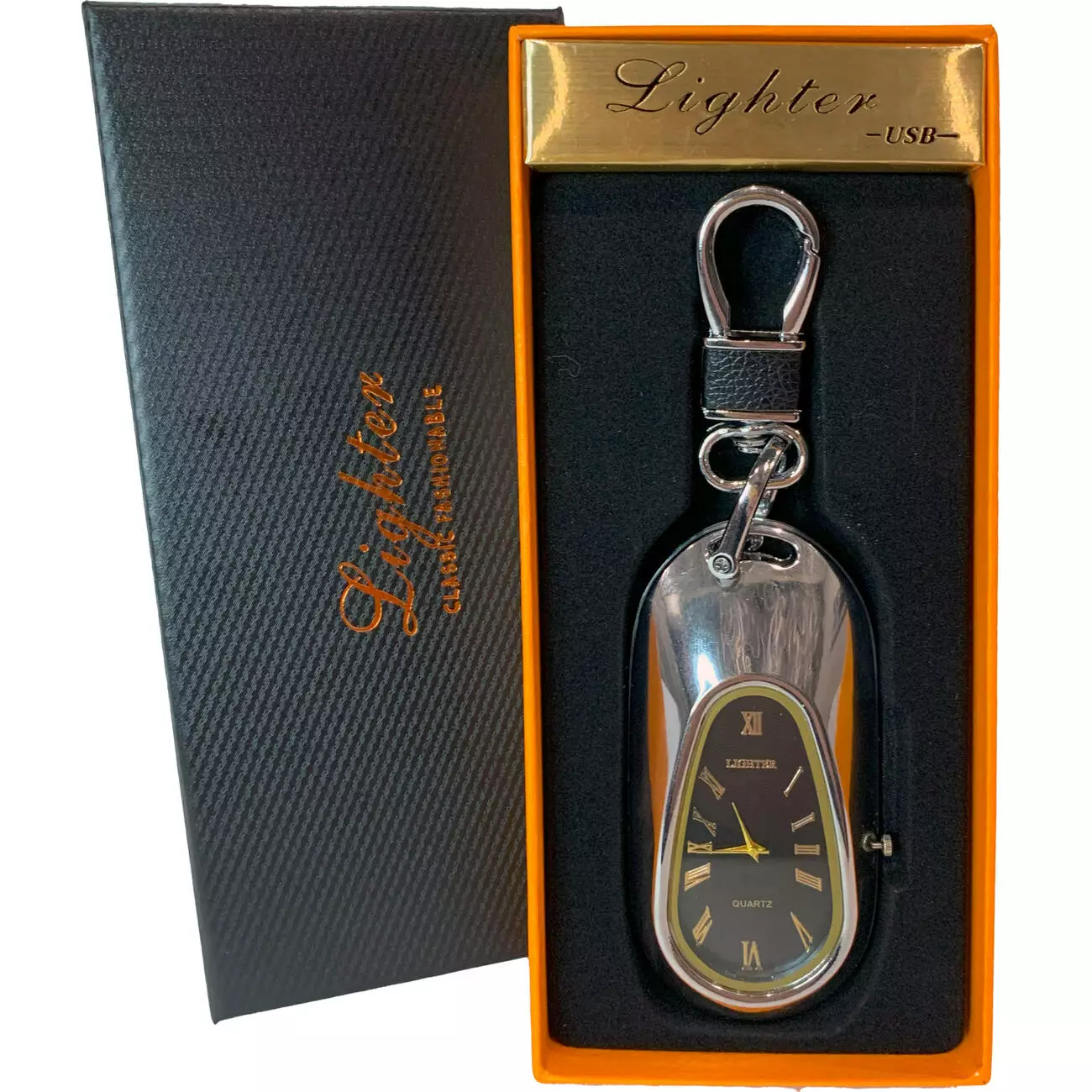 Многофункциональная USB-зажигалка с кварцевыми часами и карабином. Она сочетает в себе стильный аксессуар и практичное устройство для поджига.