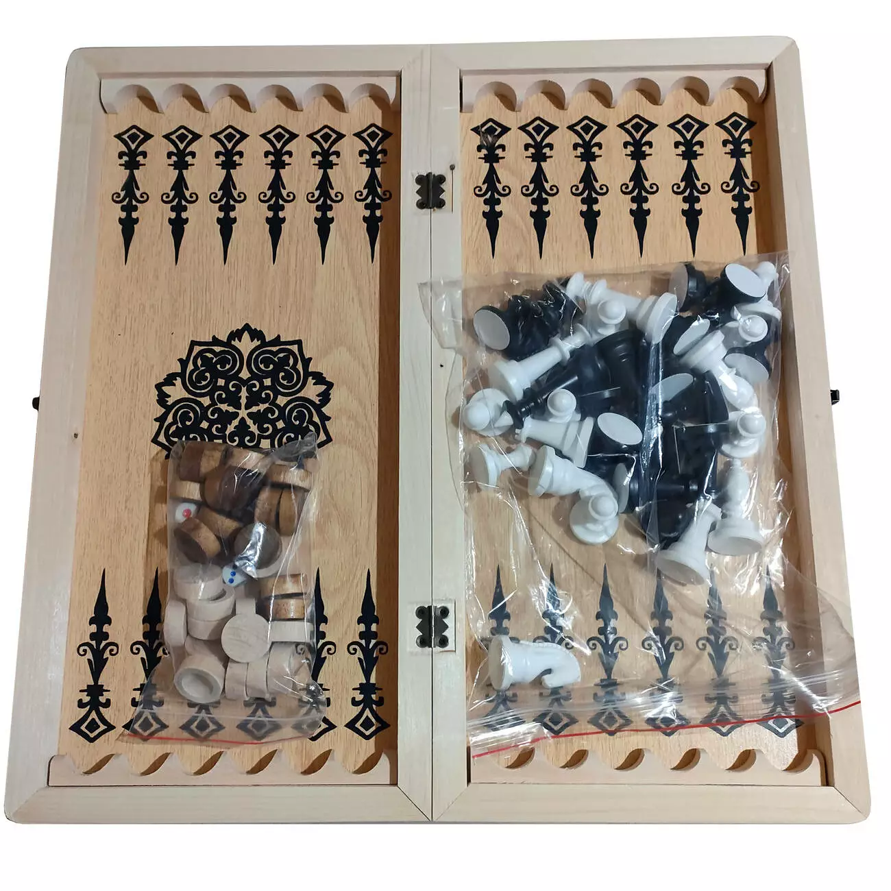 Полная комплектация: шахматные фигуры (черные и белые), шашки, кубики для нард.