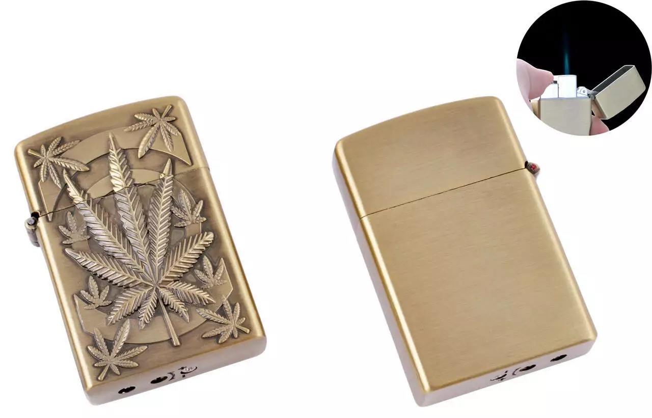 Зажигалка карманная Конопля (Острое пламя) №4906 Gold