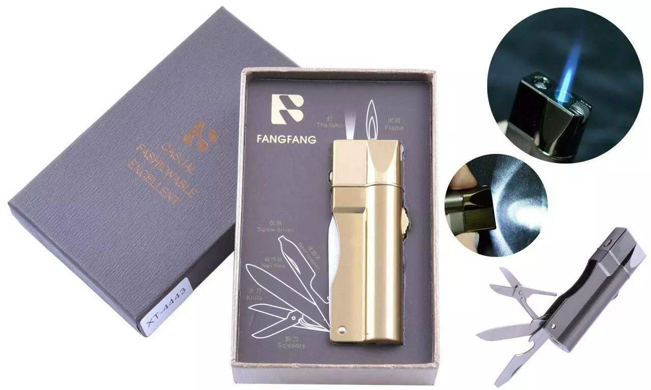 Зажигалка подарочная Fang Fang (Острое пламя, нож, фонарик) №4443 Gold