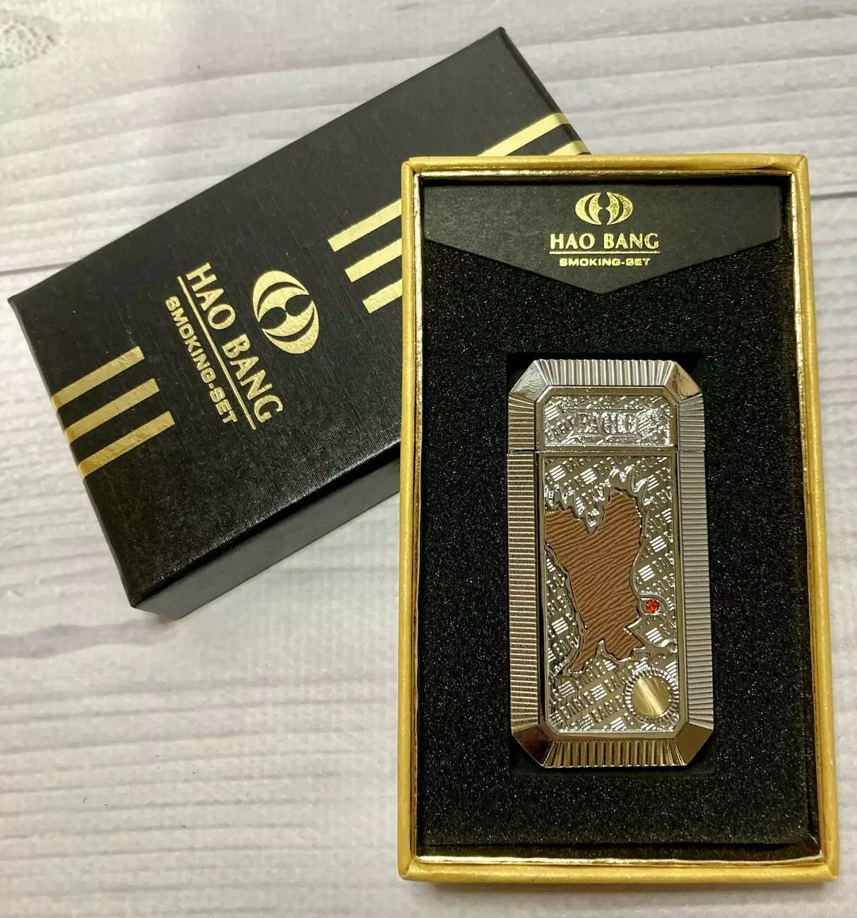 Эта эффектная зажигалка от бренда Hao Bang Smoking Set станет ярким акцентом вашего образа или отличным подарком для ценителя изысканных аксессуаров. Корпус украшен рельефным изображением орла — символа силы, свободы и уверенности.