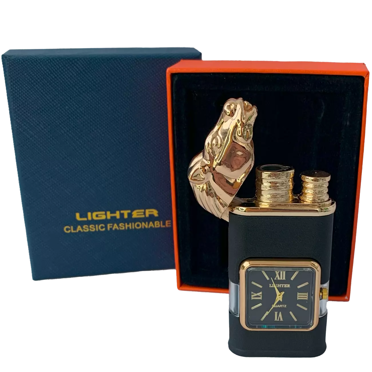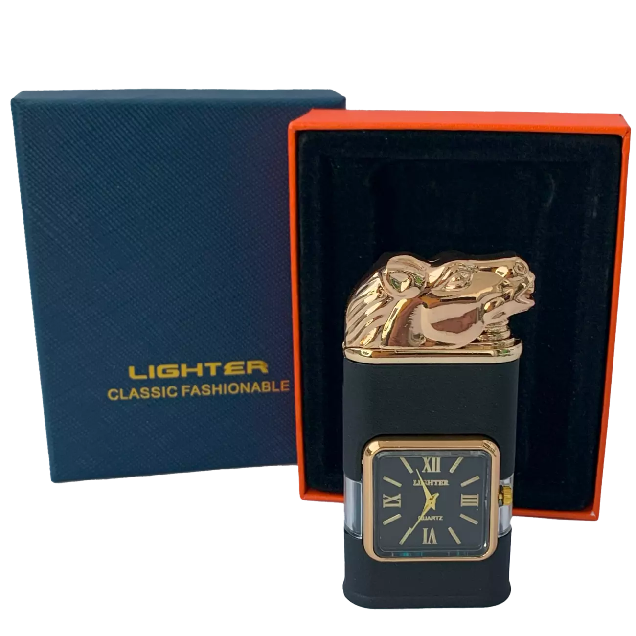 Стильная и практичная зажигалка с кварцевыми часами – это не только удобный аксессуар, но и символ статуса и элегантности. Оригинальная крышка в виде головы коня подчеркивает изысканный вкус владельца и делает модель уникальной.