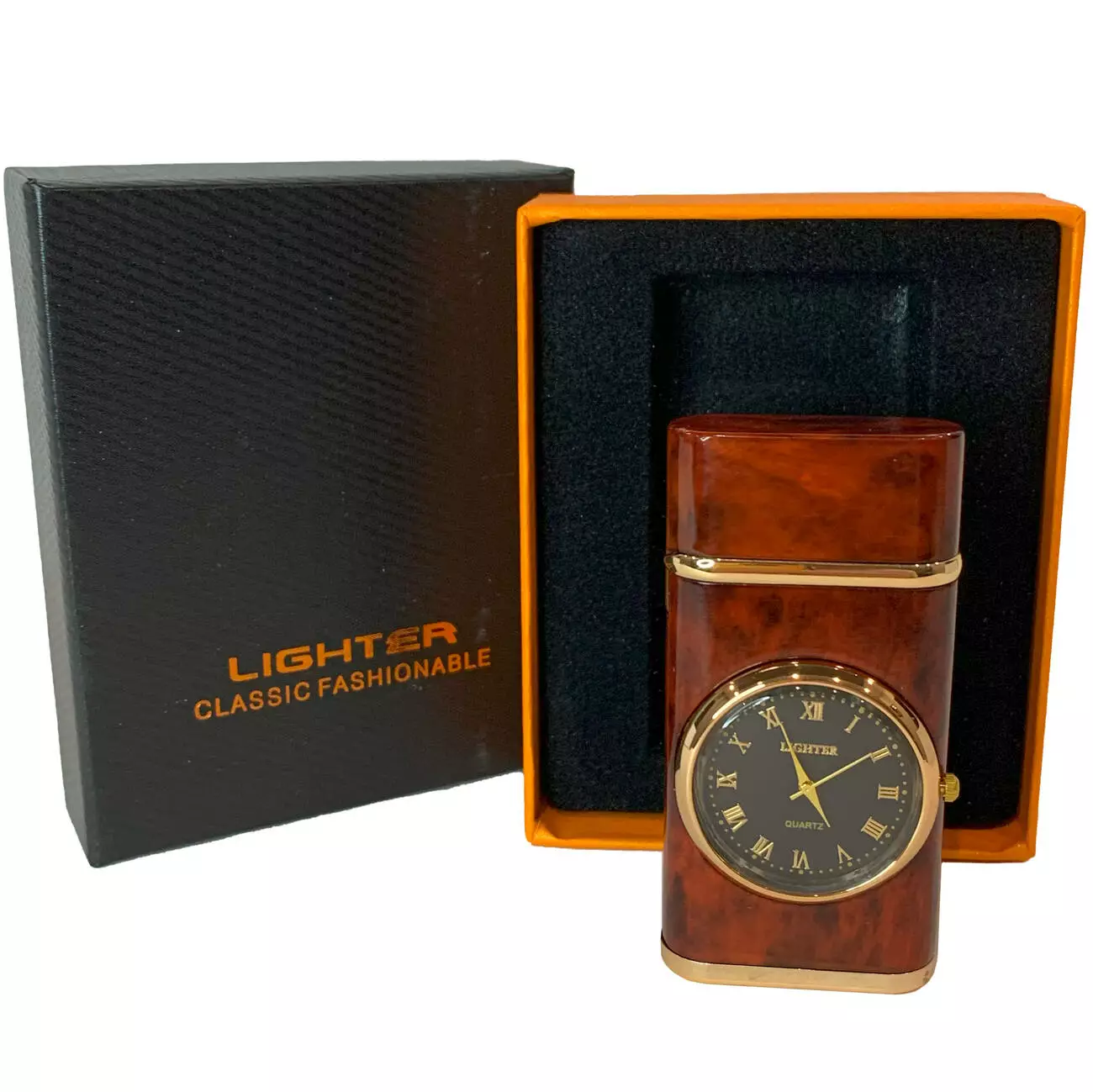 Элегантная зажигалка с встроенными кварцевыми часами – это сочетание классического дизайна и практичности. Корпус выполнен под дерево с глянцевым покрытием, а золотистые элементы придают аксессуару роскошный вид.